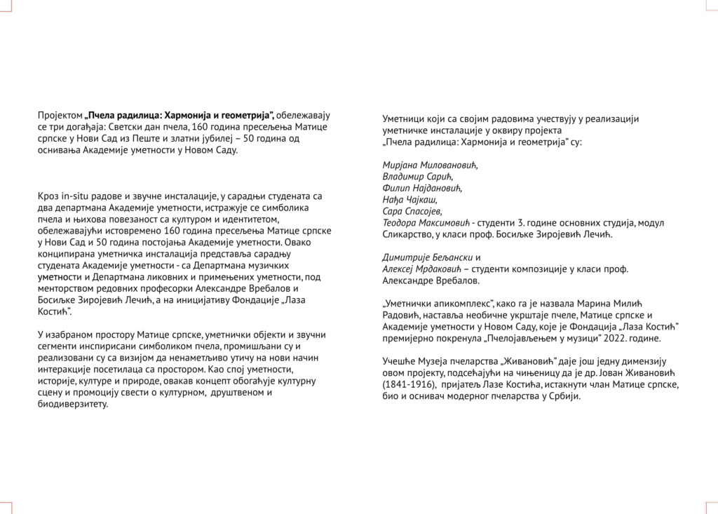 „Ово је била ретка прилика да заједно раде два департмана, Музички и Ликовни. Наша је жеља да таквих могућности има што више“, изјавила је проф. Босиљка Зиројевић, уживајући у инсталацијама својих студената обавијеним у музику пчела која ће се од 20. до 27. маја свакодневно разливати по простору централног степеништа Матице српске. Пројектом „Пчела радилица: Хармонија и геометрија”, кроз in-situ радове и звучне инсталације, у сарадњи студената са два департмана Академије уметности, истраживала се симболика пчела и њихова повезаност са културом и идентитетом, обележавајући истовремено 160 година пресељења Матице српске у Нови Сад и 50 година постојања Академије уметности. Овако конципирана уметничка инсталација представља сарадњу студената Академије уметности – са Департмана музичких уметности и Департмана ликовних и примењених уметности, под менторством редовних професорки Александре Вребалов и Босиљке Зиројевић Лечић, а на иницијативу Фондације „Лаза Костић“.